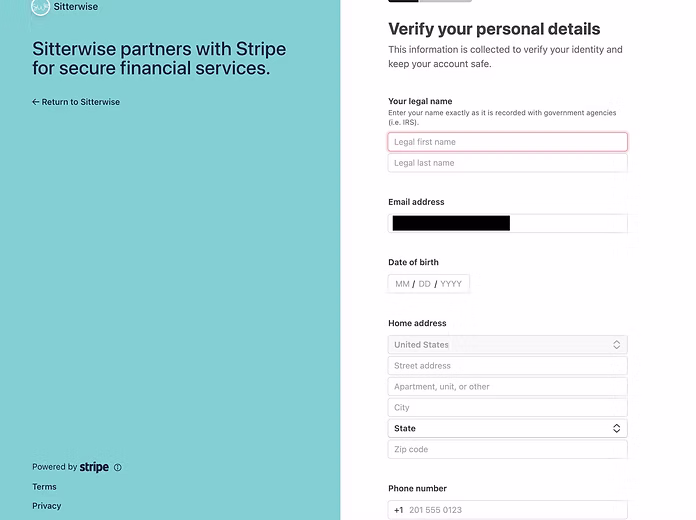 Enter your “business” details. Remember, this is for the jobs you are paid for as an independent contractor (private families paid through the app), not the jobs you are paid for as an employee of Sitterwise through payroll (events, YMCA, church jobs, care.com). Enter the information exactly as you see it here.